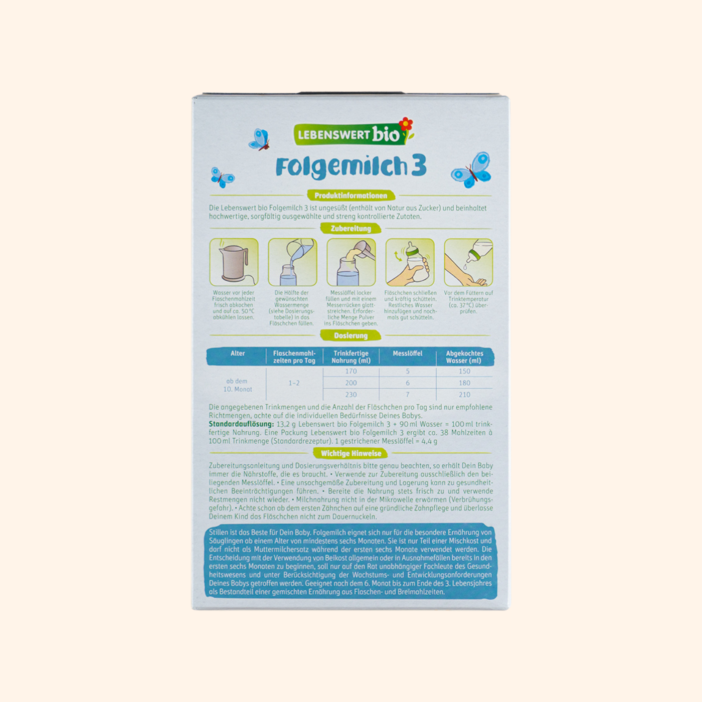 This stage is similar to Lebenswert Stage 1 but has a different protein ratio to accommodate the dietary needs of older babies. In other words, Lebenswert Stage 2 changes in the same way breast milk changes over the course of lactation.